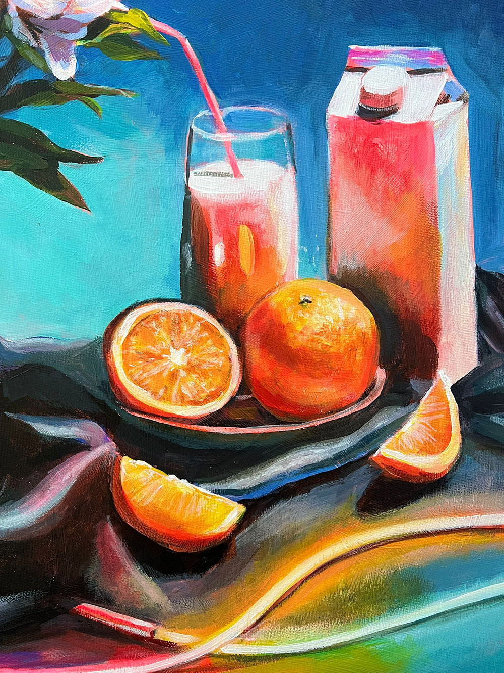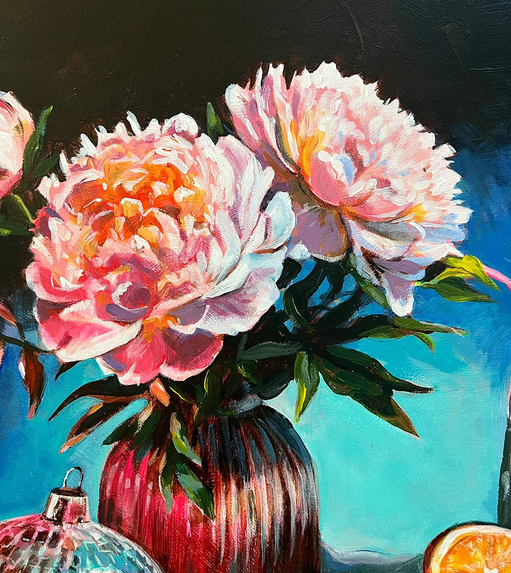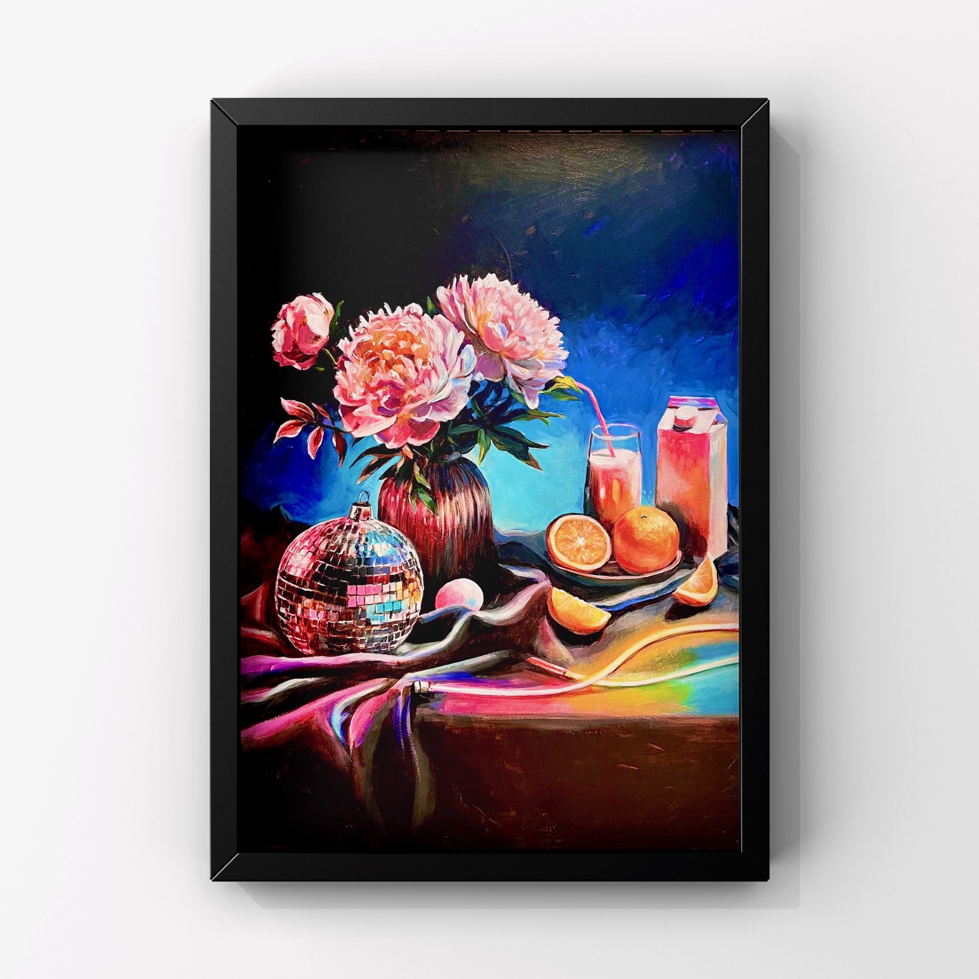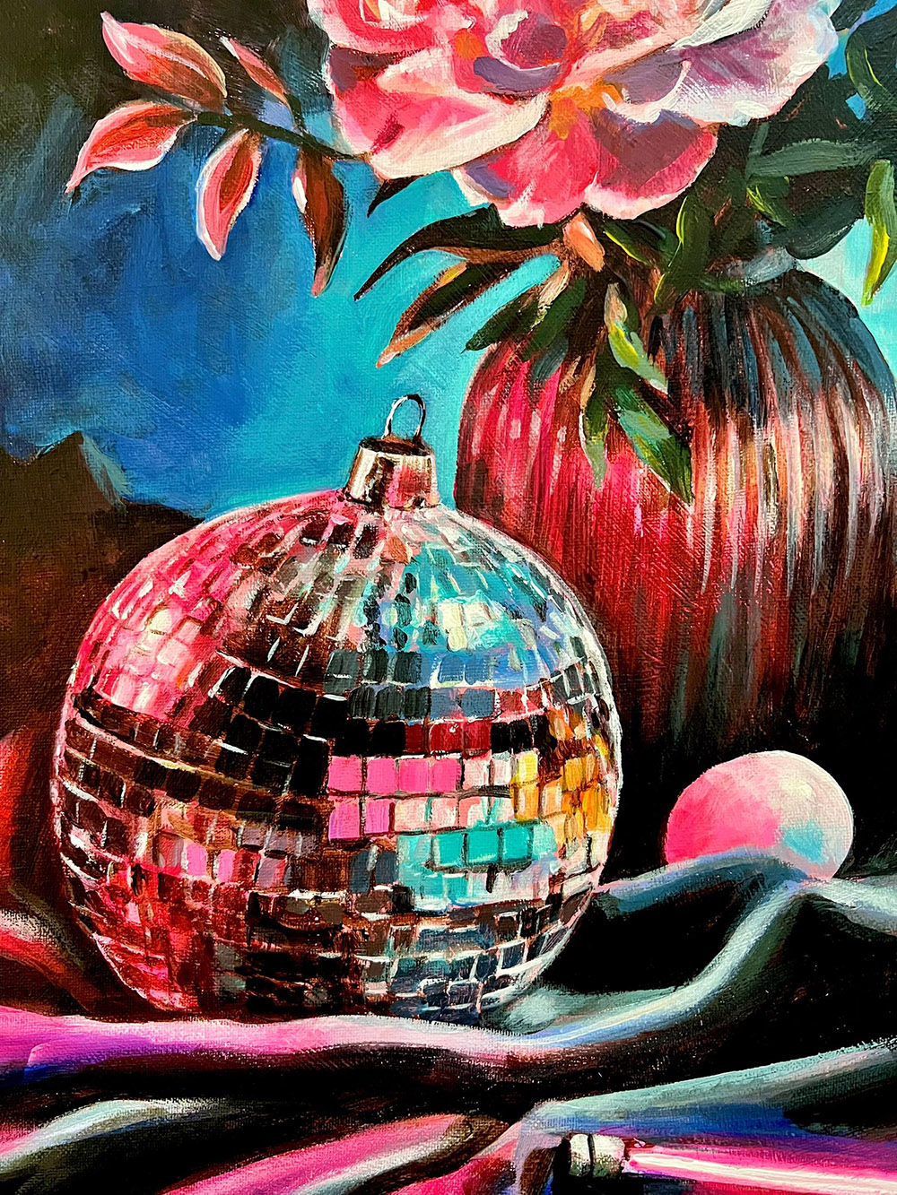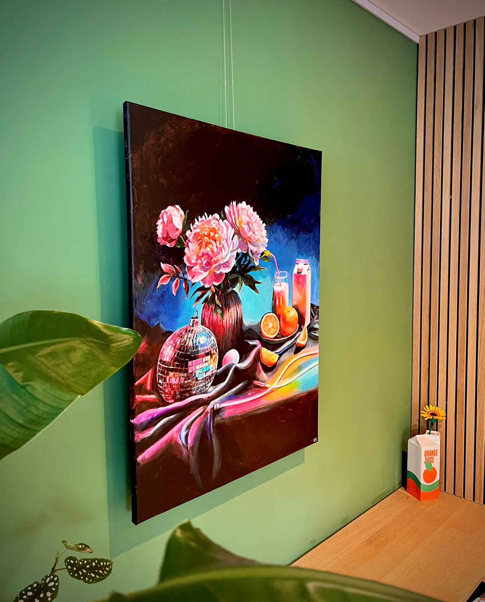 We see a classic still life with peony flowers, oranges and milk. But there’s also a modern touch to be seen – a disco ball and a neon thread!