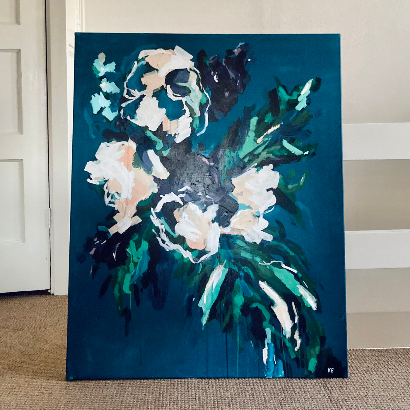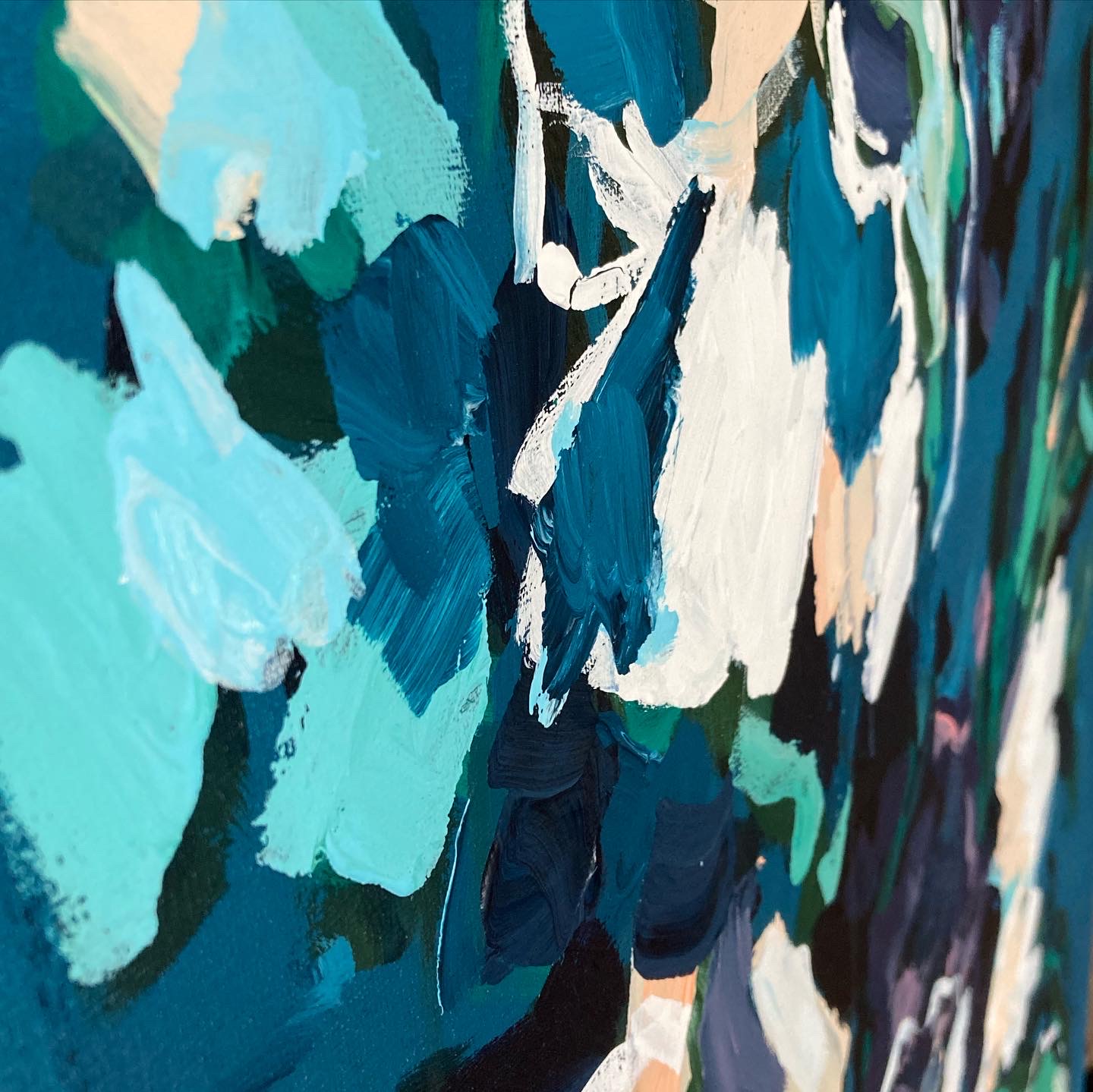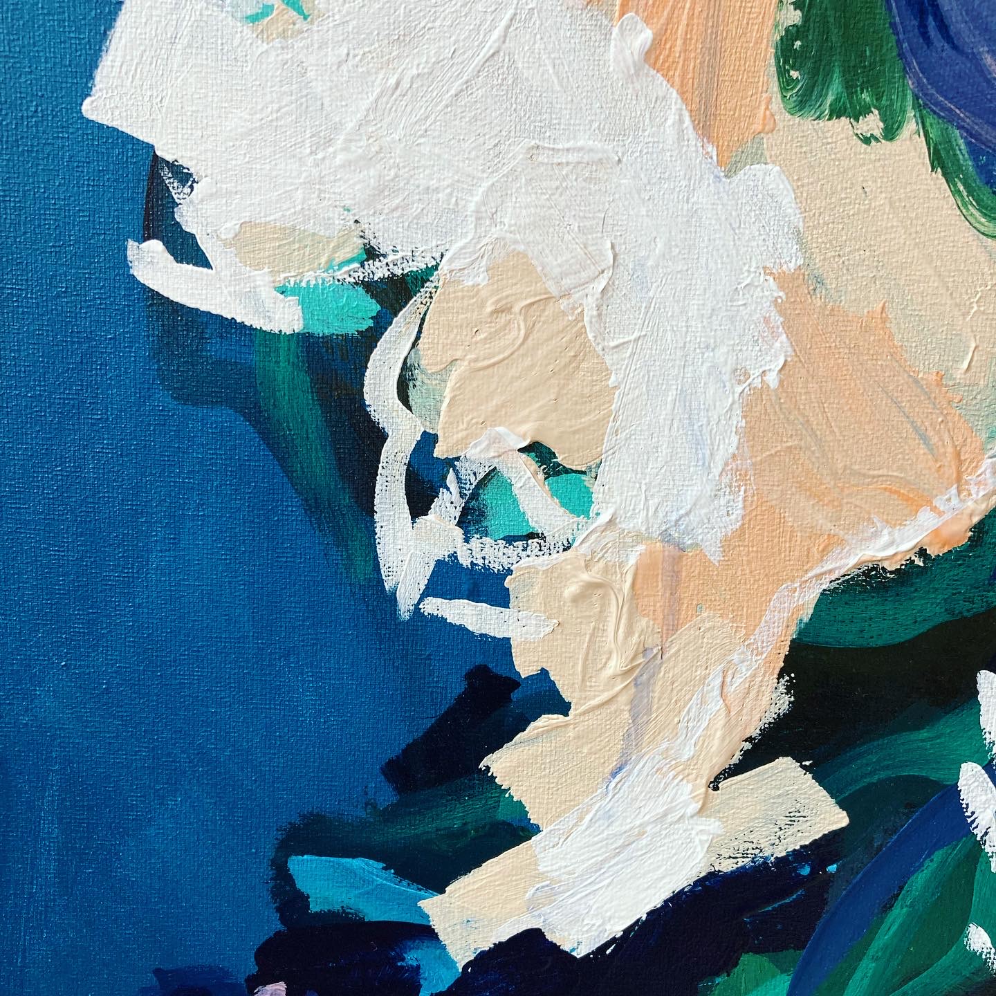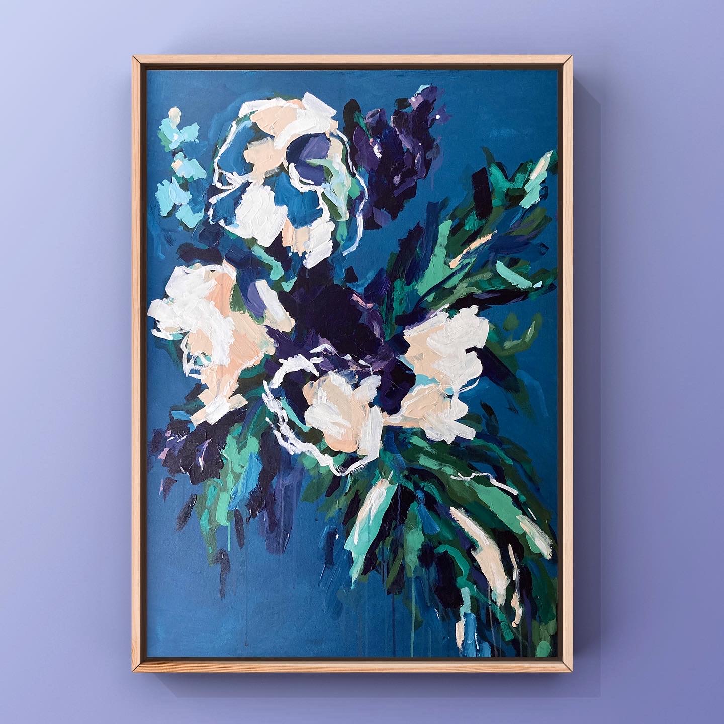 VioletViolet is a vibrant, almost dramatic canvas with big color contrasts. The light blue and purple highlights, in addition to the white flowers, still make it bright. 80 x 100 cm acrylic on canvas 2022 SOLD